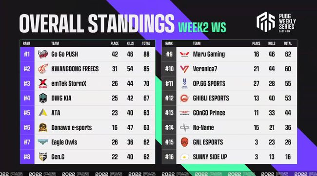 고고푸시는 3일 오후 온라인으로 열린 ‘2022 펍지 위클리 시리즈(이하 PWS)’ 페이즈1 위클리 서바이벌 2주 2일차 경기까지 88점(46킬)을 기록하면서 1위로 마무리했다. 고고푸시와 함께 2주차 ‘위클리 파이널’에 오른 팀은 광동, 이엠텍, 담원, ATA, 다나와, 이글아울스, 젠지다.