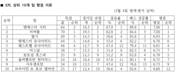 종합 평점에서, 이번 시즌 선두를 질주하고 있는 맨체스터 시티는 리버풀과 맨 앞자리를 나눠 가졌다. 리버풀이 경기당 슈팅(19.5:18.3개)과 득점(70:64골)에서 앞선 반면 점유율(67.9:62:8%)과 패스 성공률(89.8:84.4%)에선 맨체스터 시티가 우위를 보였다. 곧, 점유율과 패스 성공률에서 으뜸인 맨체스터 시티가 주도권과 화려함에 치중했다면, 리버풀은 “축구는 골로 말한다.”라는 명제에 충실했음이 엿보인다.