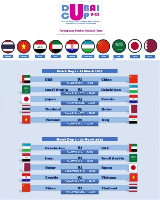오는 3월 23일 열리는 두바이 아우디 U-23 컵에서는 중국을 비롯해서 일본, 카타르, 베트남, 태국, 아랍에미리트(UAE), 이라크, 크로아티아, 우즈베키스탄, 사우디아라비아 등 총 10개국 23세 이하(U-23) 대표팀이 참가한다.