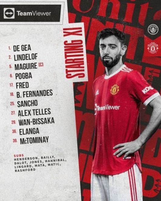 원정팀 맨유는 4-2-3-1 포메이션으로 맞선다. 앤서니 엘랑가, 폴 포그바-브루노 페르난데스-제이든 산초, 프레드-스콧 맥토미니, 알렉스 텔레스-해리 매과이어-빅터 린델로프-아론 완 비사카, 다비드 데 헤아가 출전한다.