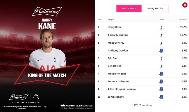프리미어리그는 공식 홈페이지를 통해 KOTM(King of the Match)를 선정했다. 팬들 투표로 결정되는 가운데 1위는 71.1%의 선택을 받은 케인이었다.