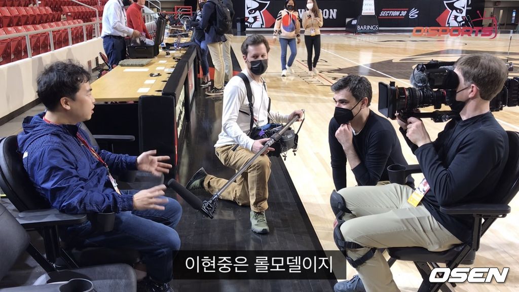 이현중은 “한국에서 이비블라주 작가님이 특별히 내 이름과 ‘대한민국’을 한국어로 새겨서 선물해주셨다. 조국을 대표한다는 것이 큰 영광이고 때로 부담도 되지만 즐기고 있다”는 내용을 유창하게 영어로 답했다.