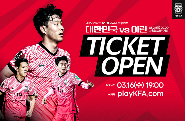 대한축구협회는 오는 24일 서울월드컵경기장에서 열리는 2022 카타르 월드컵 아시아 최종예선 9차전 이란과의 경기 입장권을 16일부터 판매한다고 발표했다.