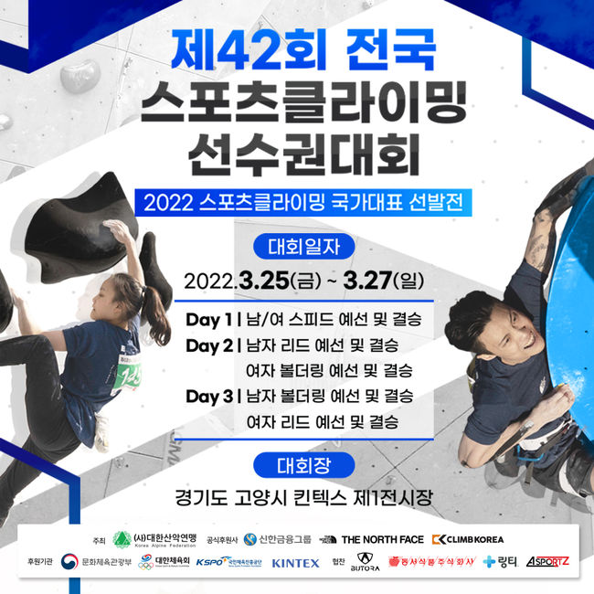 사단법인 대한산악연맹(회장 손중호)은 오는 25일부터 27일까지 3일 간, 경기도 고양시 킨텍스 제1전시장에서 제42회 전국 스포츠클라이밍 선수권대회를 개최한다.