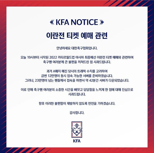 축구협회는 "과거 A매치 매진 당시의 트래픽 수치를 고려해 금번 12만 명이 동시 접속 가능한 서버를 준비했다. 그러나 23만명이 넘는 팬들께서 접속을 하면서 약 42분간 서버가 다운됐다"고 설명했다.