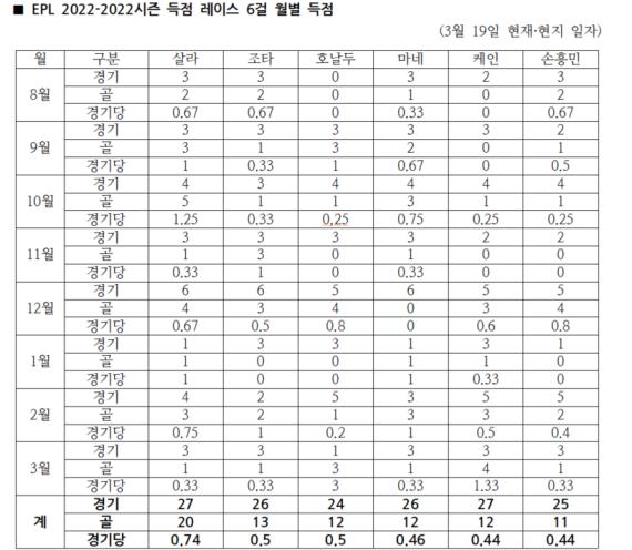 케인과 ‘영혼의 짝꿍’을 이루는 손흥민도 케인의 후반 스퍼트에 밀렸다. 중반부까지 토트넘의 공격을 이끌며 한결같은 득점감을 뽐낸 손흥민은 시즌 전체 경기당 평균에선 엇비슷했다. 케인이 0.444골인데 비해 손흥민은 0.44골이었다. 하지만 중반부 이후 경기당 평균 득점에선, 손흥민은 0.5골(14경기-7골)로 케인과 다소 거리가 있었다.