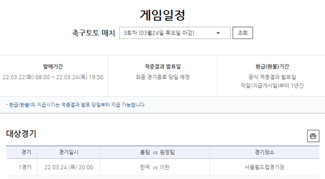 한편, 이번 축구토토 매치 3회차 게임은 24일(목) 밤 7시 50분까지 구매가 가능하며, 경기가 모두 종료된 후에 결과가 공식 발표된다. 또한 이번 대상경기는 프로토 승부식 24회차의 한경기구매(135~137번)로도 참여가 가능하다.
