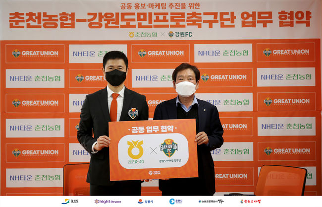 강원FC와 춘천농협은 22일 강원FC 춘천 사무국에서 강원FC 이영표 대표이사와 춘천농협 임태환 조합장이 참석한 가운데 공동 홍보·마케팅 추진을 위한 업무 협약을 체결했다.