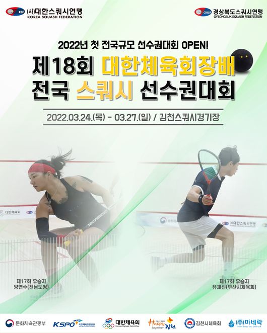 대한스쿼시연맹(회장 허태숙, 이하 연맹)은 3월 24일(목)부터 2월 27일(일)까지 4일간 ‘제18회 대한체육회장배 전국 스쿼시 선수권대회’(이하 대회)를 개최한다.