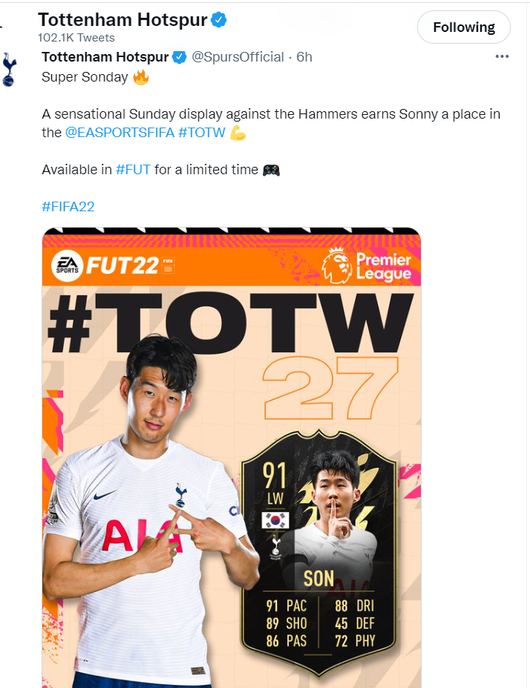 경기 후 반가운 소식도 있었다. 토트넘 공식SNS는 “손흥민이 웨스트햄을 상대로 두 골을 넣으며 불타는 일요일을 보냈다. 손흥민이 피파22 금주의 팀에 선정됐다”고 축하했다.
