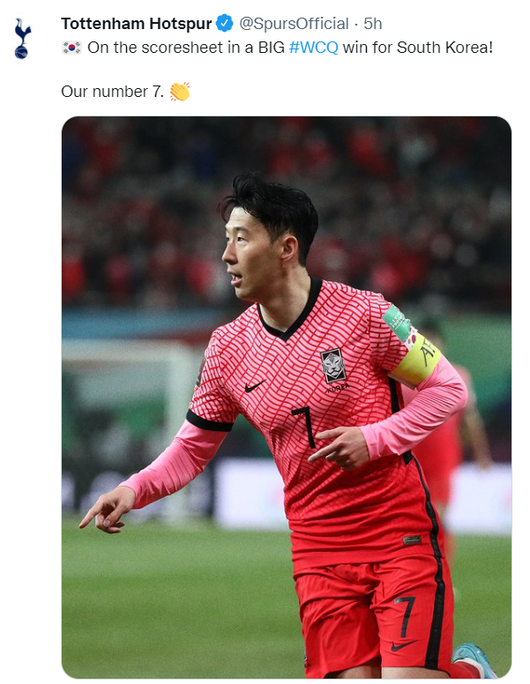 경기 후 토트넘 공식SNS도 “우리 7번이 또 해냈다! 월드컵 최종예선에서 한국을 위해 엄청난 골을 넣었다”며 손흥민의 활약상을 칭찬했다.