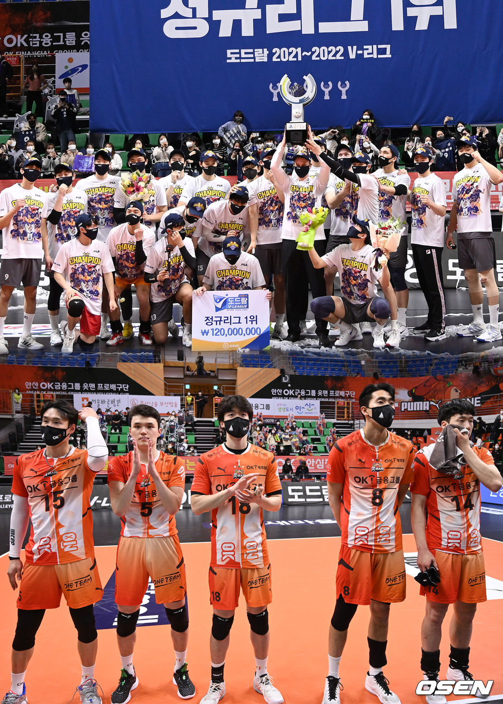 안산 상록수체육관에서 열린 ‘도드람 2021-2022 V-리그’ OK금융그룹과 대한항공의 경기, OK금융그룹 선수단이 정규리그 1위를 차지한 대한항공 선수단에게 박수를 보내고 있다. 2022.03.25 / sunday@osen.co.kr