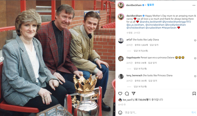 베컴은 27일(한국시간) 영국에서 ‘마더스 데이’를 맞아 어머니와 함께 찍은 사진을 자신의 SNS에 올렸다. 사진 속에서 어린 꽃미남인 베컴은 알렉스 퍼거슨 전 맨유 감독과 함께 다정하게 포즈를 취하고 있다.