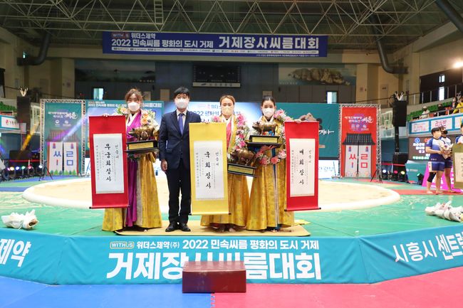 한유란(거제시청)과 엄하진(구례군청), 이다현(거제시청)이 '위더스제약 2022 민속씨름 평화의 도시 거제 거제장사씨름대회'에서 나란히 황소트로피를 들어올렸다.