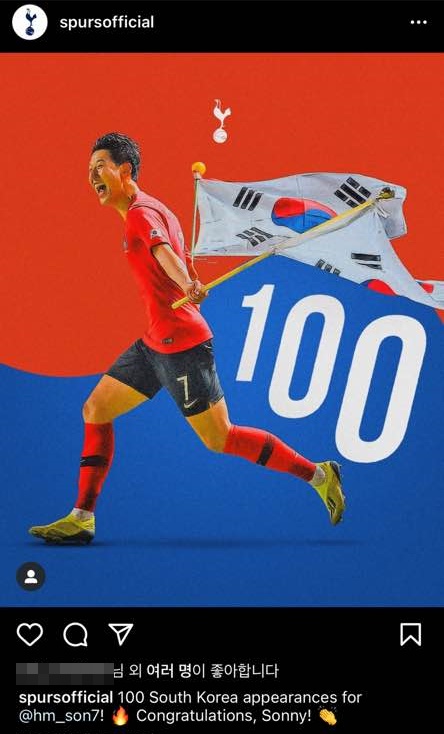 토트넘은 29일 공식 SNS를 통해 손흥민의 100번째 A매치 출전을 축하했다.