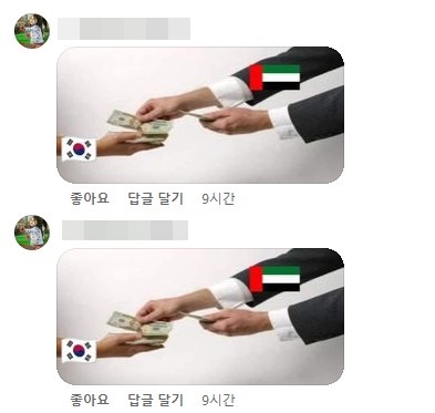 그러나 공식 페이지 댓글에는 앉아서 돈을 세는 사진과 아랍에리미트가 한국에게 돈다발을 건네는 사진이 난무했다. /10bird@osen.co.kr