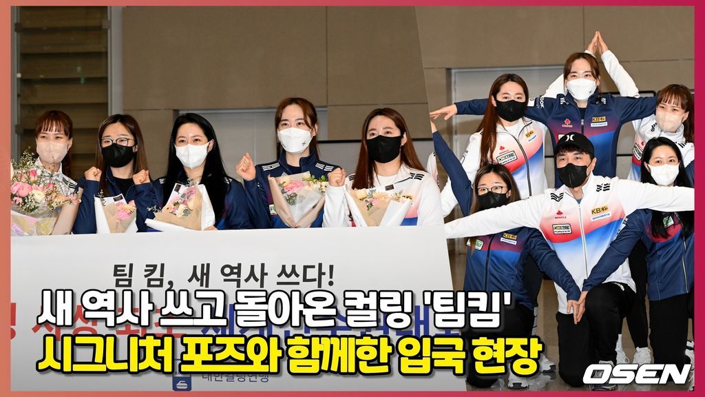 컬링 대표팀 임명섭 감독과 선수들이 귀국해 포즈를 취하고 있다. 2022.03.30 / hyun309@osen.co.kr