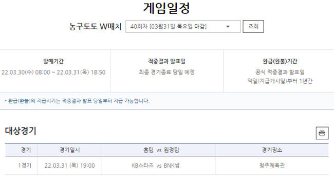 한편, 이번 농구토토 W매치 40회차는 경기 시작 10분전인 31일(목) 오후 6시50분에 발매가 마감되며, 경기가 모두 종료된 후에 적중 결과가 공식 발표된다.