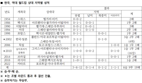외연을 대륙 연맹으로 넓혀 역대 월드컵 전적을 봐도 비슷한 전망이 내려진다. 이번 카타르 대회 조별 라운드에서, 한국은 UEFA(유럽축구연맹: 포르투갈), CONMEBOL(남미축구연맹: 우루과이), CAF(아프리카축구연맹: 가나) 산하 회원국과 각각 일전을 치른다. 역대 월드컵에서, 한국은 ▲ 유럽 국가와 5승 6무 12패(승률 34.8%) ▲ 남미 국가와 1무 4패(승률 10%) ▲ 아프리카 국가와 1승 1무 1패(승률 50%)를 각각 기록했다(표 참조).