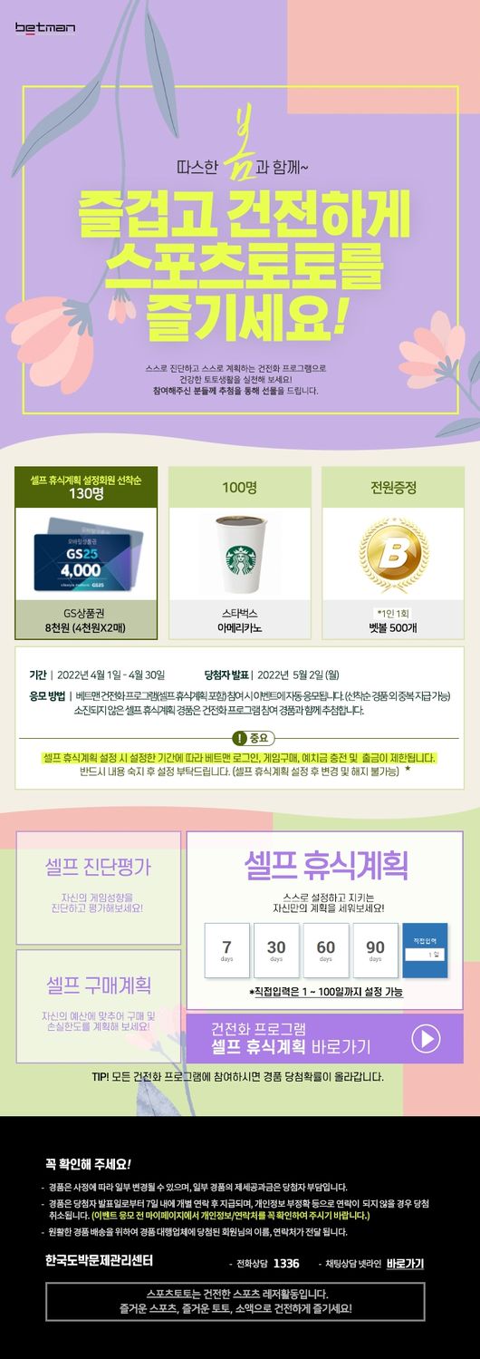 국민체육진흥공단이 발행하는 체육진흥투표권 스포츠토토의 공식 온라인 발매사이트 베트맨(www.betman.co.kr)이 4월 건전화 이벤트인 ‘따스한 봄과 함께 즐겁고 건전하게 스포츠토토를 즐기세요!’를 1일(금)부터 30일(토)까지 한 달간 실시한다.