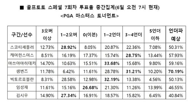 PGA 마스터스 토너먼트 1라운드 대상 골프토토 스페셜 7회차 중간집계