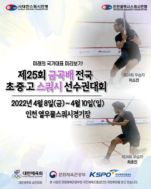 대한스쿼시연맹(회장 허태숙, 이하 연맹)은 4월 8일(금)부터 4월 10일(일)까지 3일간 ‘제25회 금곡배 전국 초중고 스쿼시 선수권대회’(이하 대회)를 개최한다.