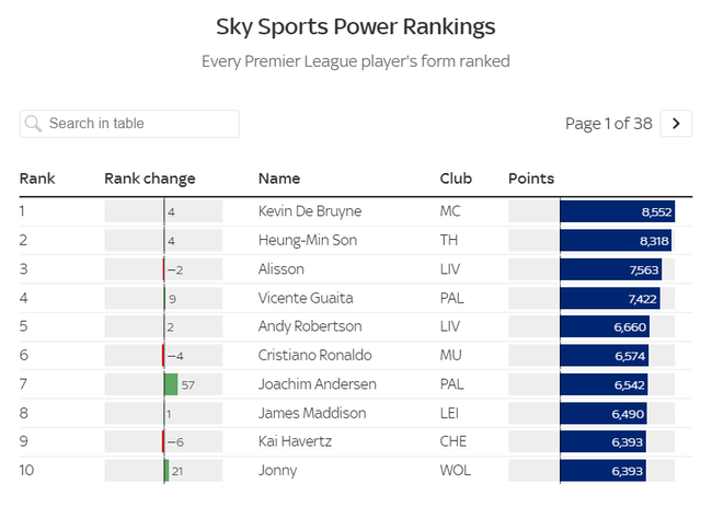 스카이스포츠는 “데 브라위너가 손흥민과 알리송을 제치고 파워랭킹 1위를 차지했다. 지난 여러 경기서 6골에 관여한 손흥민이 2위에 올랐다. 리버풀 수문장 알리송은 정상에서 3위로 내려왔다”고 서술했다.