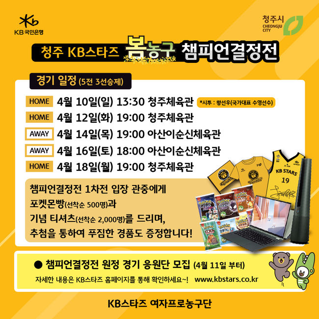 여자프로농구 2021~2022시즌 챔피언결정전에 선착한 청주 KB국민은행 스타즈(구단주: 이재근)가 오는 10일(일) 청주체육관에서 진행되는 챔피언결정전 1차전을 앞두고 봄농구 잔치 준비를 마쳤다.