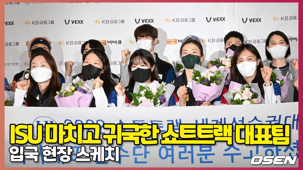 쇼트트랙 대표팀이 귀국해 기념촬영을 하고 있다. 2022.04.12 / hyun309@osen.co.kr