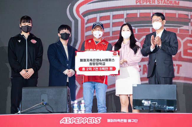 장매튜 페퍼저축은행 대표는 "이번 장학금이 AI 페퍼스 배구단 연고지역 대학생들에게 조금이나마 도움이 될 수 있어 기쁘다"며 "어려운 시기이지만 희망이 있다면 어떠한 어려움도 헤쳐나갈 수 있다는 마음으로 미래를 향해 전진해 나가길 바란다"고 말했다.