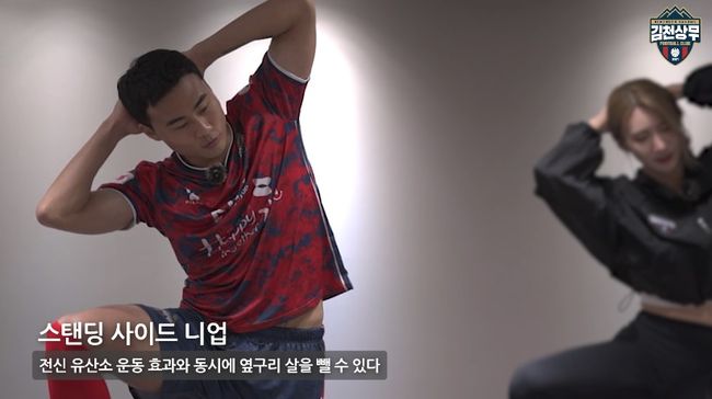 영상을 통해 김천상무 주장 정승현과 국가대표 수비수 박지수는 홈 트레이닝법을 알려주고, 치어리더 박세린은 운동을 따라했다. 정승현은 매트를 활용한 다양한 운동법을 준비했다.