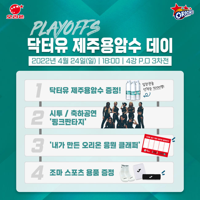 오리온은 4강 플레이오프 첫 홈경기를 맞아 경기 당일 오후 4시부터 입장객 선착순 1000명에게 ‘닥터유 제주용암수’를 증정한다. 고양체육관 1층에 마련된 응원부스에서는 문구를 직접 꾸며 넣을 수 있도록 특별히 제작한 ‘내가 만든 오리온 응원 클래퍼’를 제공하고, 경기 중 응원 타임에 클래퍼로 열정적인 응원을 펼친 팬들을 선정해 선수들의 친필 사인이 담긴 의류를 선물한다.