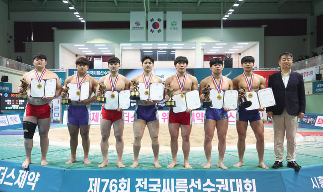 임주성(경장급(75kg이하)/경기대), 라현민(청장급(85kg이하)/울산대), 정종진(용장급(90kg이하)/영남대), 이민웅(역사급(105kg이하)/동아대), 김민재(장사급(140kg이하)/울산대)가 22일(금) 강원도 인제군 원통체육관에서 열린 ‘제76회 전국씨름선수권대회’ 선수권부 각 체급 결승전에서 일반부 선배들을 누르고 정상에 올랐다.