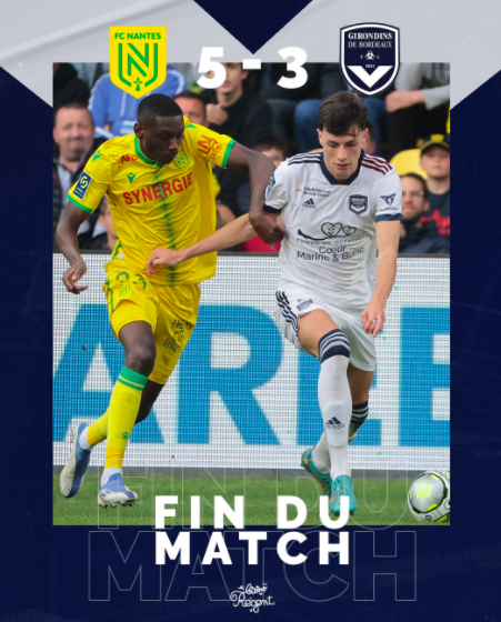 보르도는 24일(한국시간) 프랑스 낭트에 위치한 스타드 드 라 보주아르에서 열린 2021-2022 프랑스 리그1 34라운드에서 낭트에 3-5로 역전패를 당했다.
