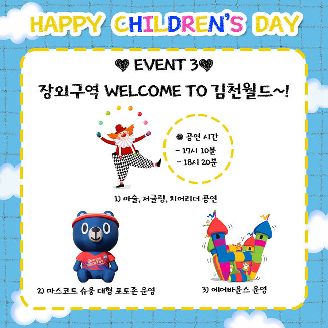 어린이날을 맞아 김천상무 전 직원, 치어리더 및 응원단장, 운영 스태프 등은 머리띠와 어깨띠를 착용해 어린이들을 반길 예정이다. 매표 및 검표 스태프들은 슈웅이의 얼굴이 그려진 야광 머리띠로 아이들을 맞는다. 야광 머리띠는 외6문 부근 장외구역에서 마스코트 슈웅이와 가위바위보 이벤트를 통해 어린이 선착순 100명에게 증정할 예정이다.