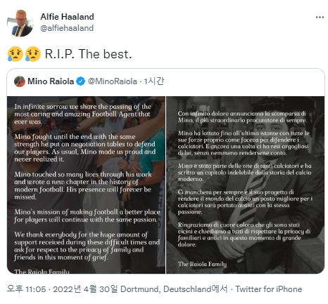 알피는 라이올라의 사망 소식을 인용하며 "미노, 너는 세상 최고의 에이전트였어. 하늘에서 푹 쉬길"이라고 고인을 기렸다.