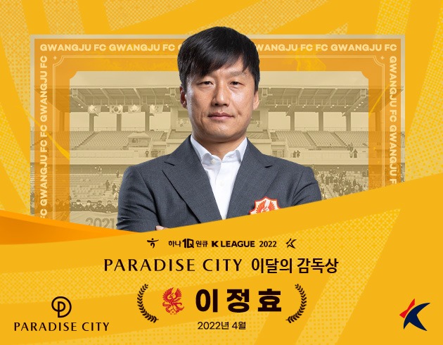 한국프로축구연맹은 K리그2 광주FC의 이정효 감독이 4월 '파라다이스시티 이달의 감독상'을 수상했다고 2일 밝혔다.