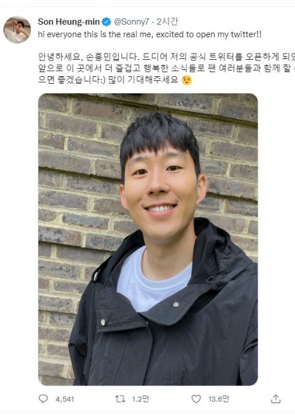 '손흥민은 지난 3일(이하 한국시간) 트위터 계정에 셀카와 함께 “여러분 안녕, 이건 진짜 내가 맞다. 트위터를 열게 돼 설렌다(Hi everyone, this is the real me, excited to open my Twitter!)”며 팬들을 향한 메시지를 올렸다.