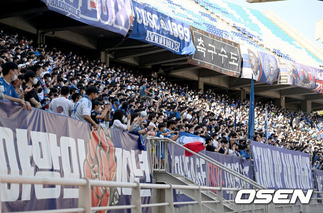 ‘빅버드’의 분위기도 사뭇 달랐다. 미리 녹음된 응원과 서포터들의 현장응원은 차원이 달랐다. 이날 1만 1418명이 모여 모처럼 웅장한 분위기가 연출됐다. 울산에서도 대거 원정응원을 왔다. 양팀 팬들이 펼치는 응원전이 장관이었다.
