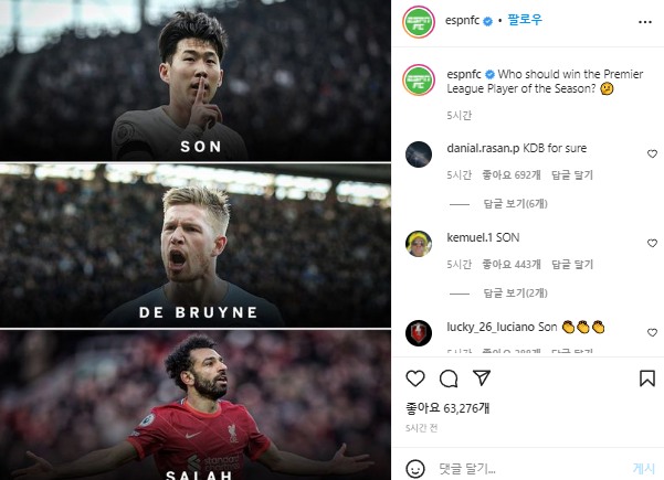 미국 'ESON은 손흥민과 데 브라위너, 살라의 순으로 사진을 나열하면서 "이번 시즌 PL 올해의 선수를 수상하는 사람은 누구일까"라는 질문을 던졌다.