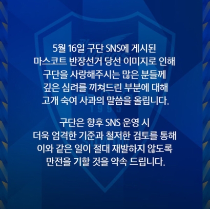 또 수원은 "5월 16일 구단 SNS에 게시된 마스코트 반장선거 당선 이미지로 인해 구단을 사랑해주시는 많은 분들께 깊은 심려를 끼쳐드린 부분에 대해 고개숙여 사과의 말씀을 올립니다"라고 사과하는 한편 "구단은 향후SNS 운영 시 더욱 엄격한 기준과 철저한 검토를 통해 이와 같은 일이 절대 재발하지 않도록 만전을 기할 것을 약속드립니다"라고 재발 방지를 약속했다. /10bird@osen.co.kr