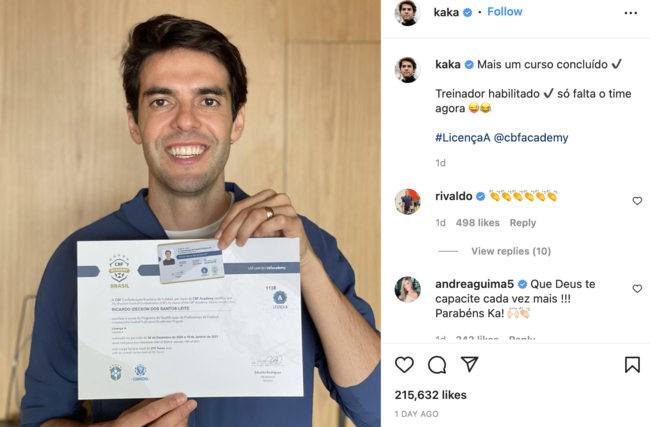 A급 지도자 자격증을 획득한 카카는 "마침내 코칭 라이센스 코스를 하나 더 완료했다. 이제 코치가 가능하다"라면서 "이제 팀만 구하면 된다"라고 기쁨을 나타냈다.
