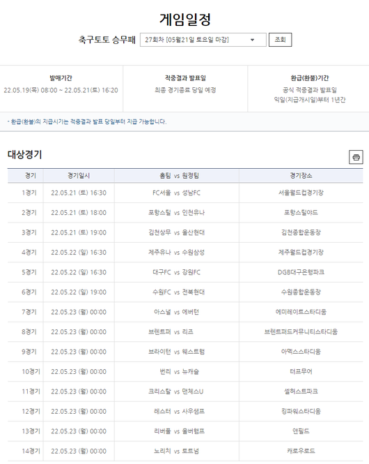국민체육진흥공단이 발행하는 체육진흥투표권 스포츠토토의 수탁사업자 스포츠토토코리아가 오는 21일(토)부터 23일(월)까지 벌어지는 국내 프로축구 K리그1 6경기와 잉글랜드 프리미어리그(EPL) 8경기 등 총 14경기를 대상으로 한 축구토토 승무패 27회차 게임을 발매한다고 밝혔다.