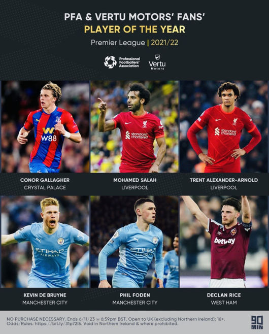 후보 명단에는 쟁쟁한 선수들의 이름이 공개됐다. 코너 갤러거(크리스탈 팰리스), 모하메드 살라, 트렌트 알렉산더 아놀드(이상 리버풀 FC), 케빈 더 브라이너, 필 포든(이상 맨체스터 시티), 데클란 라이스(웨스트햄 유나이티드)가 선정됐다.