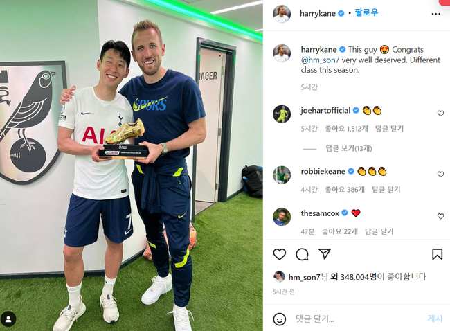 경기 후 케인은 손흥민과 함께 찍은 사진을 올리며 “손흥민은 충분히 득점왕 자격이 있다. 올 시즌 차원이 다른 활약을 펼쳤다”며 기뻐했다.