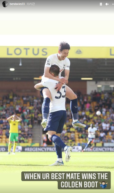 이게 끝이 아니었다. 데이비스는 자신이 손흥민을 들어 올리고 세리머니를 하는 장면을 올리며 "만약 너의 친구가 득점왕이 먹을 때 해야 할 일"이라고 여운을 즐겼다.