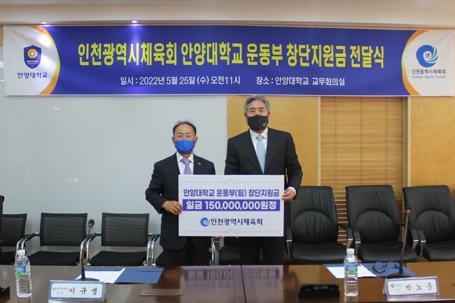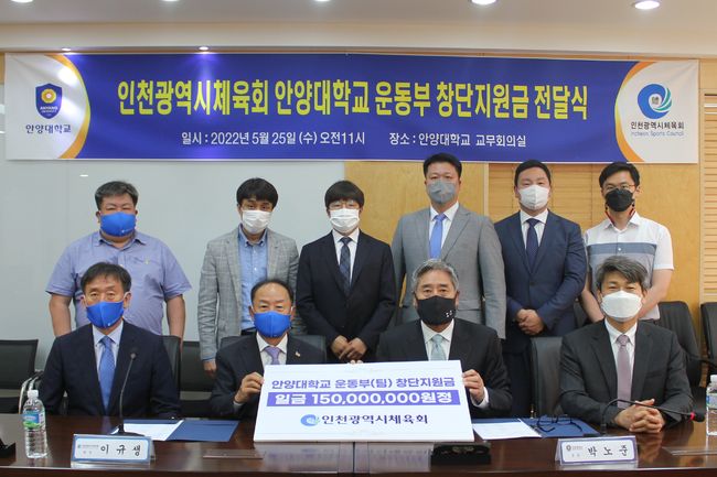 이번 운동부 창단 지원금 전달식은 안양대와 인천시체육회가 지난해 12월 체결한 학교 체육발전과 지역 체육 진흥을 위한 업무협약에 따라 이뤄졌으며, 운동부 창단지원금 1억 5천만 원은 안양대 인천 강화캠퍼스 내 훈련시설을 증·개축하는 데 사용된다.