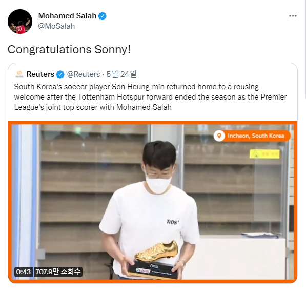 살라는 26일(한국시간) 자신의 SNS를 통해 손흥민이 골든 부트를 들고 귀국하는 기사와 영상을 게재한 뒤 "쏘니 축하해!"라고 메시지를 보냈다.