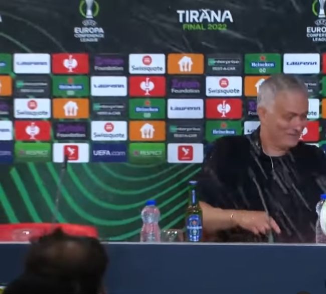 영국 '스카이 스포츠'는 26일(이하 한국시간) 공식 SNS를 통해 조세 무리뉴 감독의 경기 종료 후 기자회견 영상을 공개했다. 해당 영상에서 무리뉴 감독은 기자회견 도중 샴페인을 뒤집어썼다.