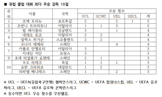 이같이 강산이 거의 일곱 번 바뀔 만큼 깊이 뿌리내린 유럽 클럽 대회에서, 무리뉴 감독은 으뜸의 자리에 올라섰다. 2000년 프리메이라리가의 벤피카에서 첫 지휘봉을 잡은 이래 22년 동안 모두 5회 정상을 밟았다. UCL(포르투 2003-2004시즌, 인테르나치오날레 밀라노 2009-2010시즌)과 UEL(포르투 2002-2003시즌, 맨체스터 유나이티드 2016-2017시즌)에서 각각 2회, UECL에서 1회 우승이 그 결실의 열매다(표 참조).